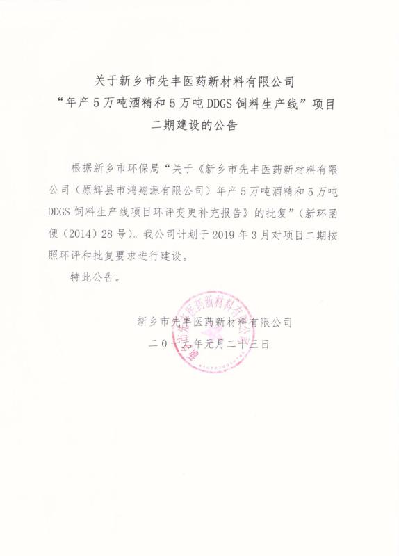 關(guān)于新鄉(xiāng)市先豐醫(yī)藥新材料有限公司“年產(chǎn)5萬噸酒精和5萬噸DDGS飼料生產(chǎn)線”項目二期建設(shè)公告
